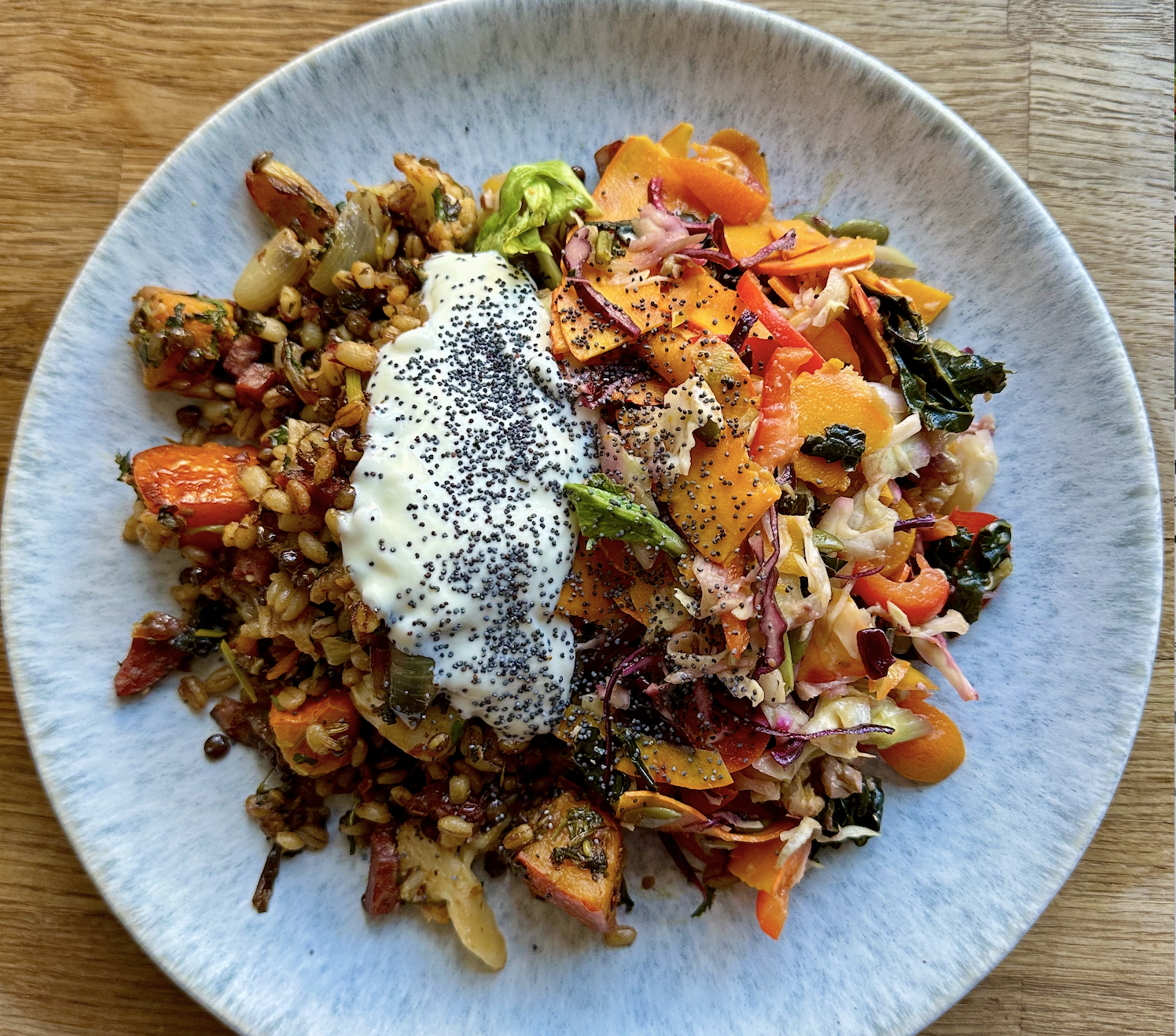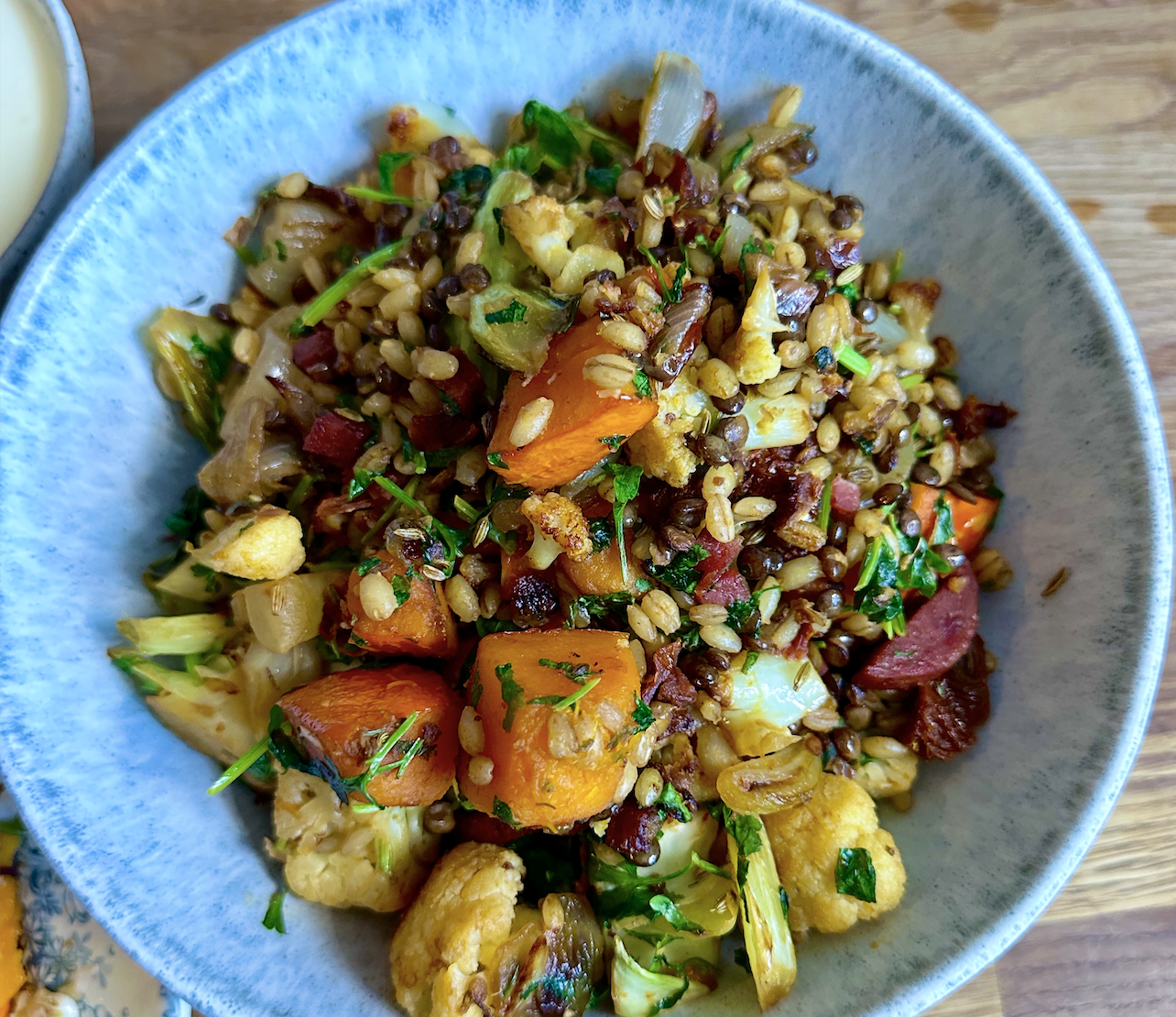 One key thing is, the total ratio of lentils and farro by volume should be no more than about half to the quantity of pan-roasted veggies, or it will feel too dry.