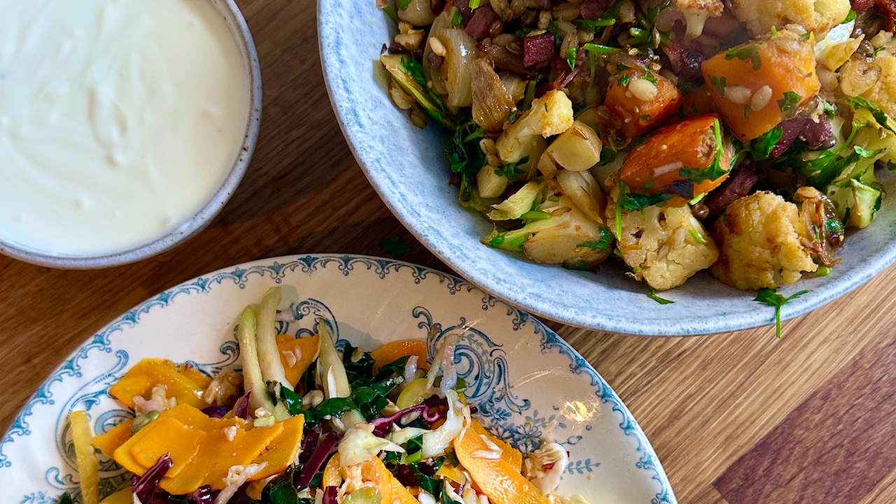 For the Mediterranean inspired pan-roasted cauliflower, pumpkin and onions with lentils and farro, you’ll need:
